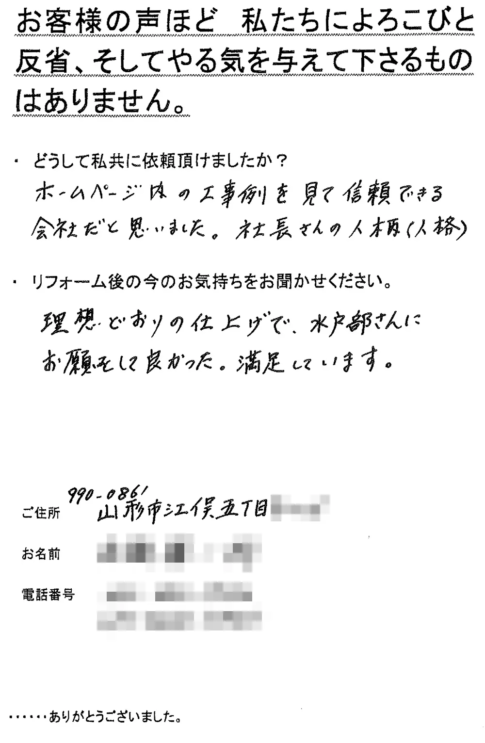 当店では、どのリフォーム・工事もお客様がご満足頂いた時点で工事終了と認識し、お代金はその後にお支払い頂く『工事ご満足安心あと払い制度』を導入していますので、ご満足いくまでなんなりと仰ってくださいね。