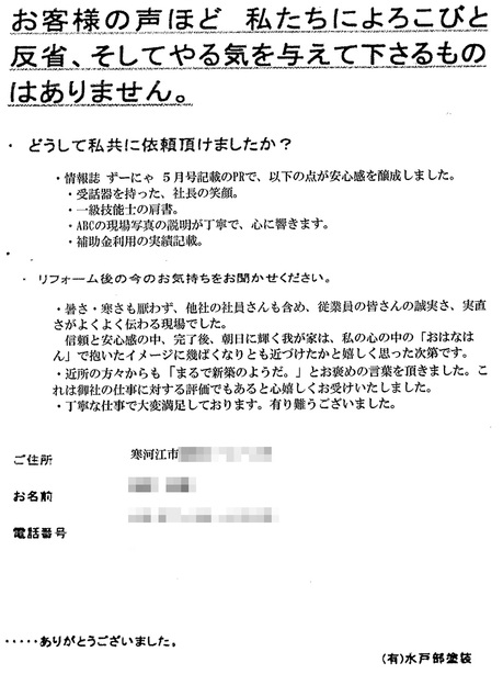 私たちは、工事終了からが本当のお付き合いの始まりと考えております。施工後には弊社の顧客通信「幸せリフォーム通信」をお送りいたしておりますので、万が一、不具合・気になる点が出てきた時にはご遠慮なくお尋ねくださいね。
