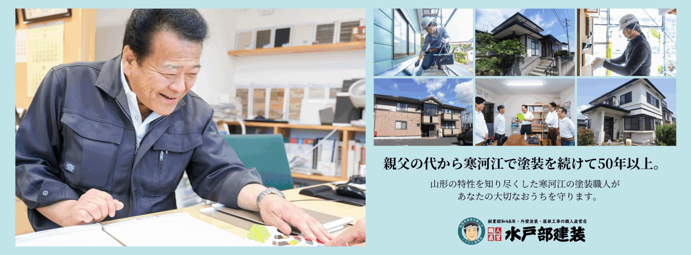 水戸部建装は、創業昭和48年以来、52年間、寒河江市・山形市の地元のお客様に、同じく地元民の立場から、寄り添った外壁塗装・屋根塗装・屋根修理・屋根工事をご提供し続けてまいりました、地元の塗装・リフォーム屋さん。