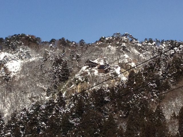 下から見上げる立石寺は雲一つない晴天に映え、なかなか良い感じ。
