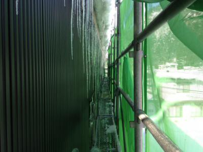 一番デカイつららは足場1段分を優に超えてます…。