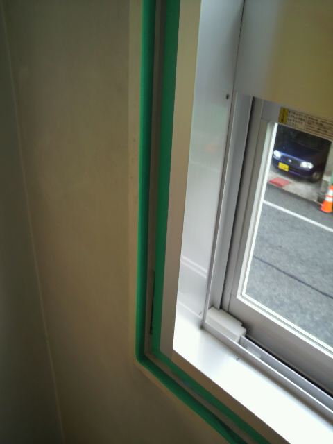 画像は既存の額縁とサッシ枠の取り合いのシーリング途中の様子です。