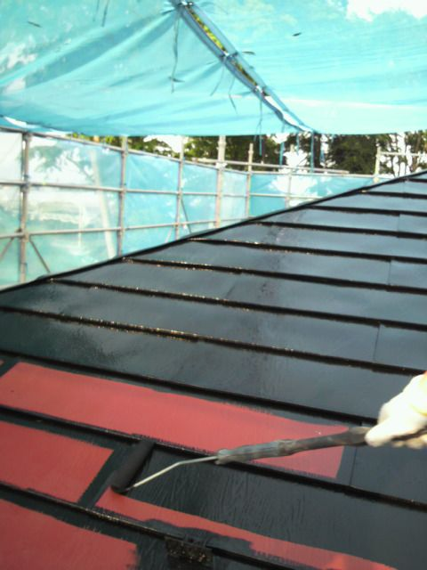 施工中のH様邸、屋根塗装の様子です。