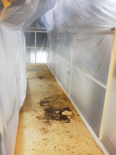上の写真は、H社様の鉄部ケレン(機械等で錆びを削り落とす作業)中、まわりに削りカス等の飛散がないように養生している様子です。まわりにタンク等の機材があり飛散は最小限にできましたが…暑かったっすガーン