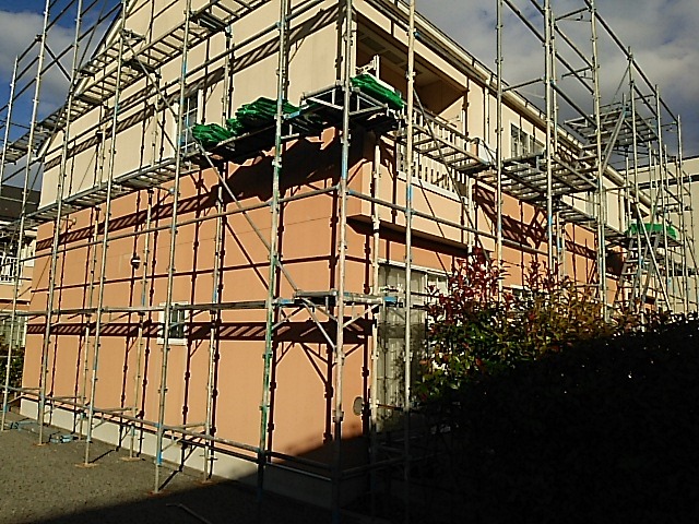 先週水曜から足場組開始の山形市内アパートへ、組み上がりの確認。