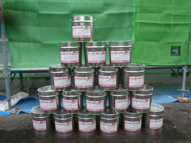 切り取ったシーリング材は2棟で土嚢袋5つ分、新しく充填したシーリング材は19缶となりました。