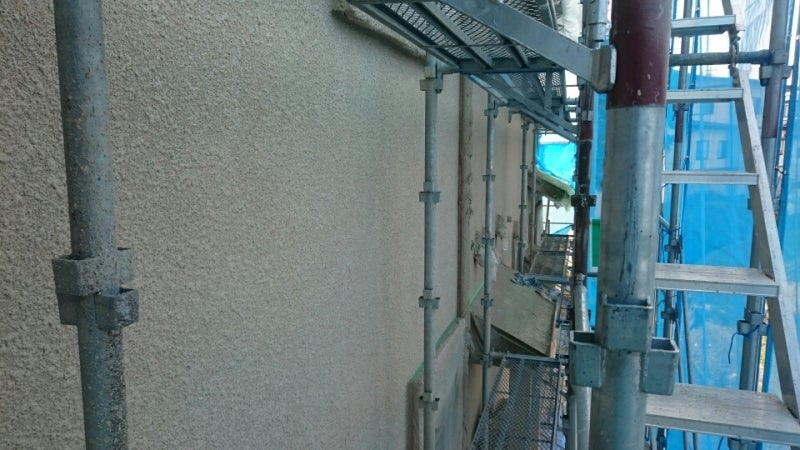 外壁吹き付け塗装が完了し、後は手塗り工事。