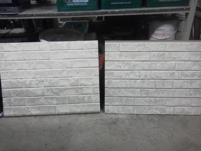 上の写真は、近々施工させていただく外壁の見本板です。見えにくいですがダブルトーン塗装(ベースの色と面色の二色塗装)です。