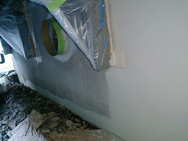 こちらは、ベランダの下になる部分ですが、本日隊長の愛弟子、なべちゃんが手伝いに来てくれて、なべちゃん、助っ人Iさん養生のもと、南、北面は下塗り完了です。