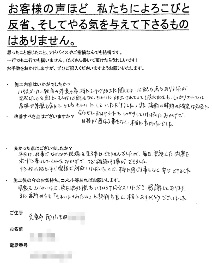塗装もていねいな上、色を決める際もいろいろアドバイスいただき感謝しております。また、近所からも「きれいになったね」と評判も良く、本当にありがとうございました。