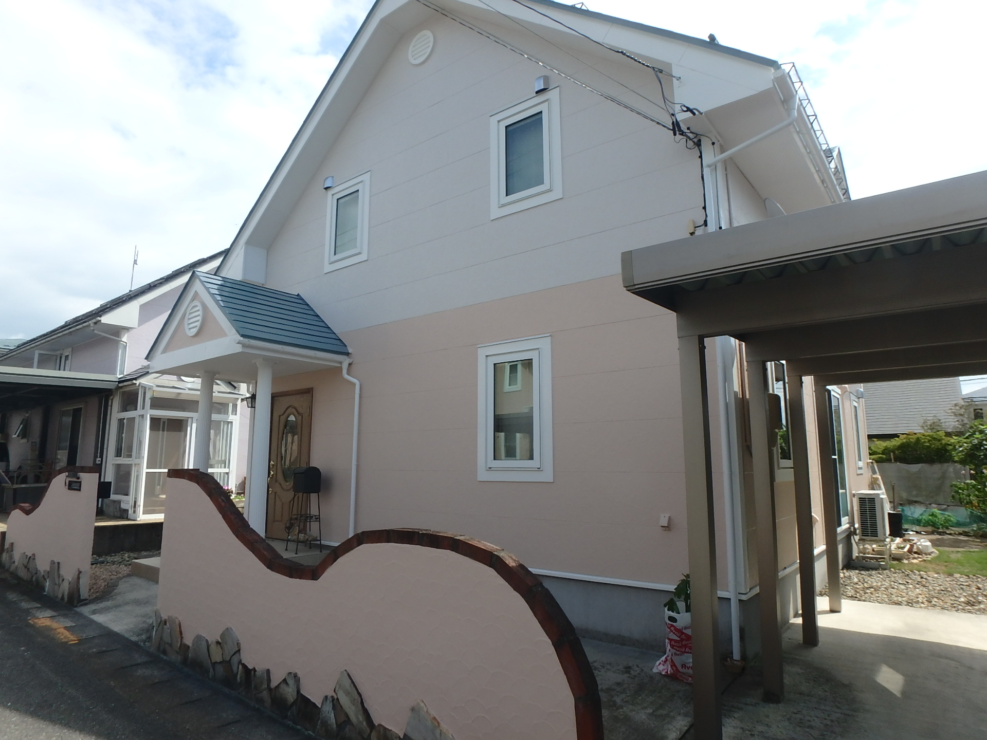 外壁塗装寒河江市 サイデイング外壁をパステル調に塗装 屋根塗装、外構塗装もセットで!やわらかい、優しい色調のツートンカラーに仕上がった施工後から施工前はこのように冷たい感じでした↓施主様の願いの詰まった配色です。塗装1つでイメージが全く変わります無料お見積はこちら