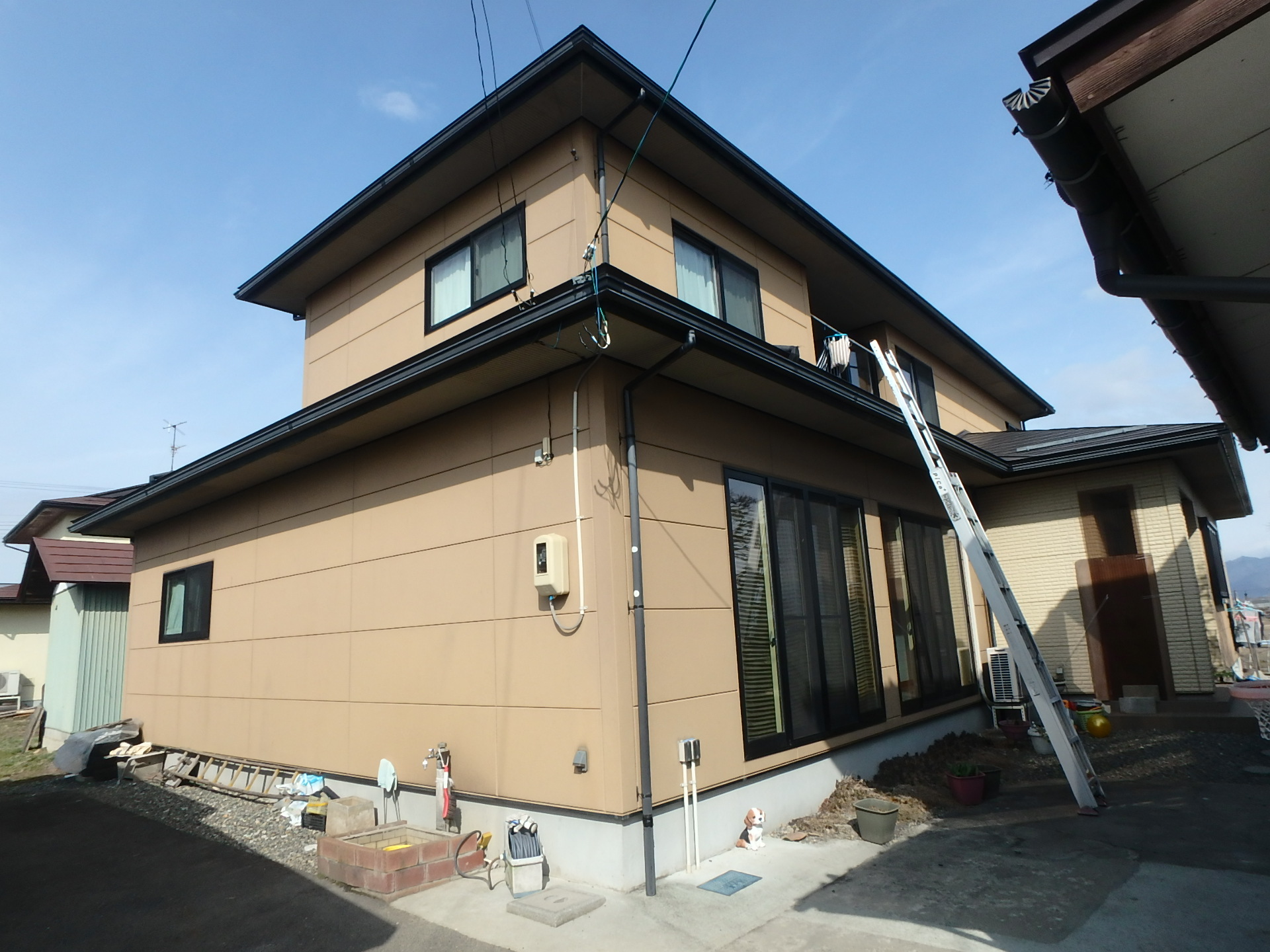 外壁塗装寒河江市 ALC外壁塗装 屋根とセットでフッ素塗装まずは施工後から外壁は二階、一階、玄関ポーチ部分と3色に塗り分けましたOLYMPUS DIGITAL CAMERA施工前はこちらOLYMPUS DIGITAL CAMERA施工前は玄関ポーチ部分のみ色分けでした。もちろんシーリングも全て打替えました無料お見積はこちら