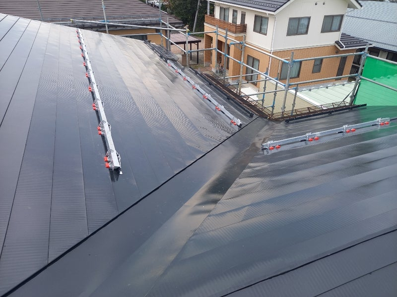 塗装完了している2階屋根へスノーストップ取り付けや。