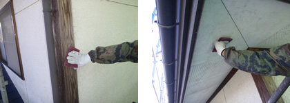 外壁も基本的に洗浄は必須です。下地の種類や雨仕舞い、納まり等を勘案して、「チョーキングを完全に落とす手洗い」、「高圧洗浄」のいずれか、または併用にてガラスやあみ戸と一緒に綺麗に洗います。